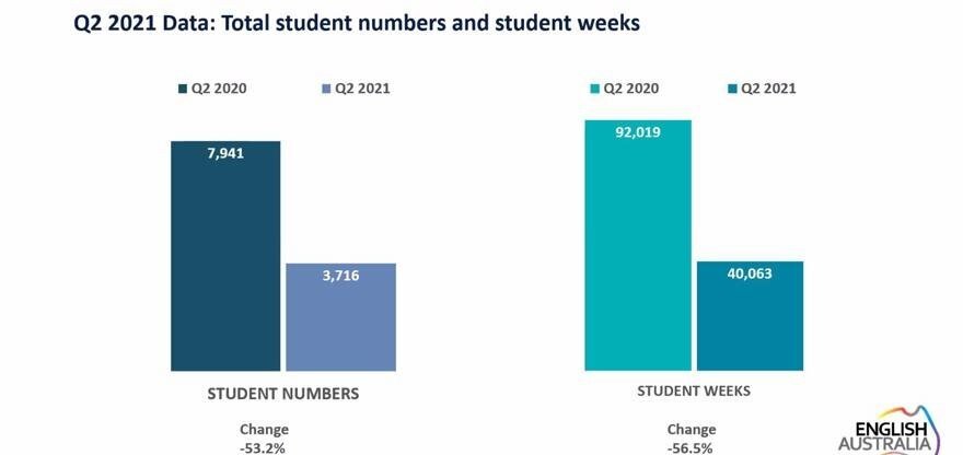 Student numbers – across all visa types - declined by 53.2 per cent to 3,716 in 2021 Q2, compared with the same quarter of the previous year, while student weeks delivered declined by 56.5 per cent to 40,063 weeks.